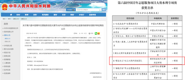 近日,由水利部、共青团中央举办的第六届中国青年志愿服务项目大赛节水护水志愿服务与水利公益宣传教育专项赛获奖名单揭晓,我院“绿迹长江”长江大保护实践团队荣获一等奖,是江苏唯一一个节水护水志愿服务类一等奖项目。