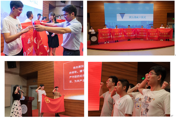 佘明为新成立的12个团支部授予支部旗,代澔丛带领现场师生重温入团誓词,庆祝中国共产主义青年团成立100周年。