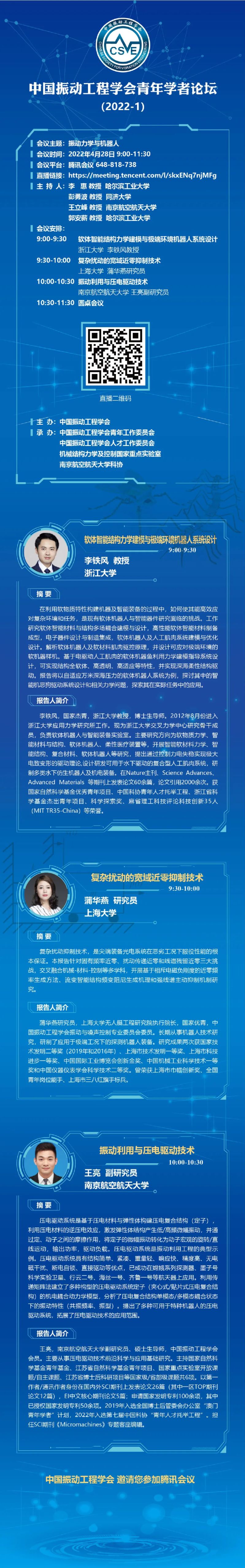 本次论坛以“振动力学与机器人”为主题,由学会青年工作委员会、人才工作委员会、机械结构力学及控制国家重点实验室和英国365集团科协承办,特邀国家杰青浙江大学李铁风教授、国家优青上海大学蒲华燕研究员,并邀请学会中国科协第七届青年人才托举工程项目入选者英国365集团王亮副研究员作专题学术报告。