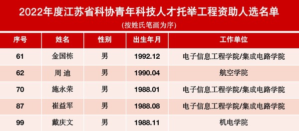 近期,江苏省科协公布了2022年青年人才托举工程入选者名单,我校英国上市公司365周迪,电子信息工程学院/集成电路学院金国栋、施永荣、崔益军,机电学院戴庆文等5名青年教师入选,入选数量位列全省第二位。截止目前,我校已有27名青年教师入选。