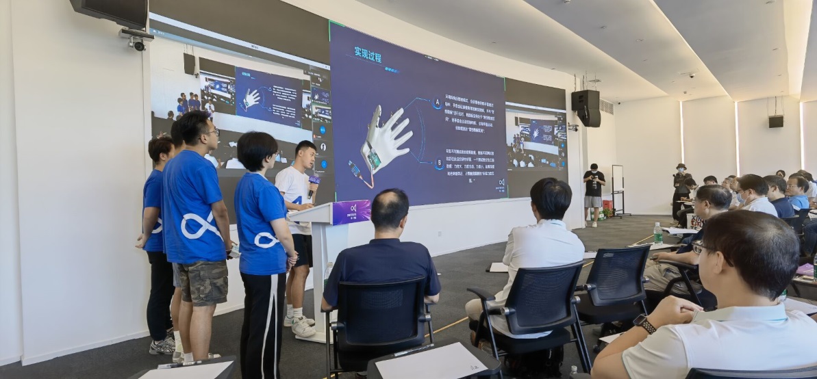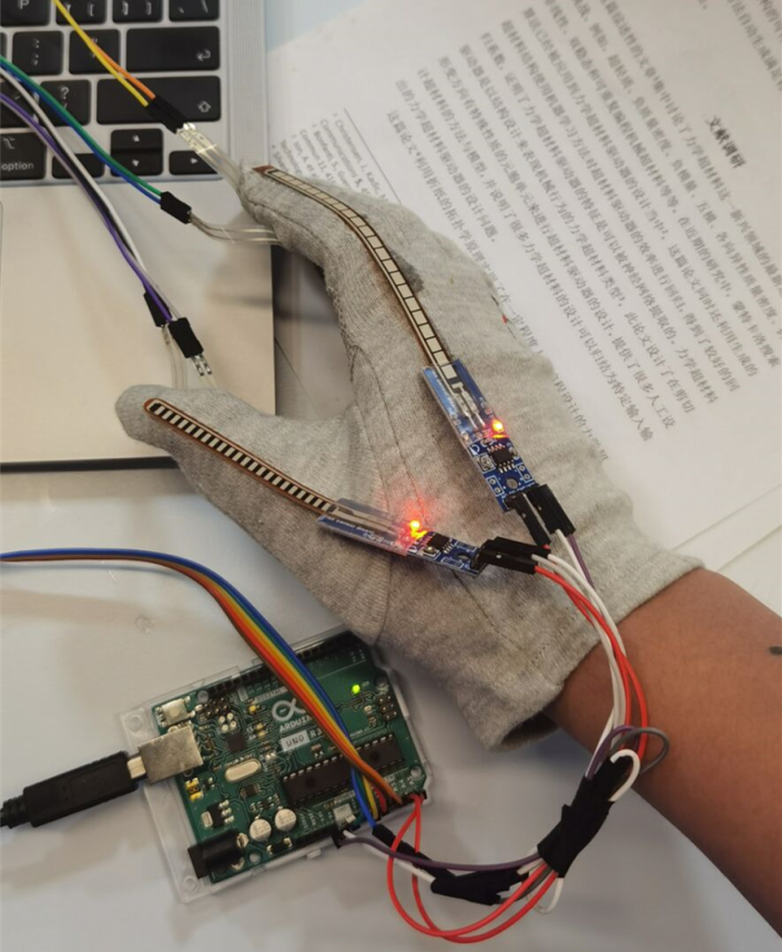 我校王宇超、吴佳良同学所在的Track2第三组,重点关注触觉传感器这一核心技术,设定主题为“基于模式存储及反馈的智能手套”项目题目。在确定选题以后,小组很快按照各个人的特长进行了合理的分工,经过了短暂的原理性探究和前期准备工作,小组开始线下采购材料和查阅文献,之后用建模软件建模,连接传感器采集数据,利用控制算法和网络算法最终完成了成果产出。