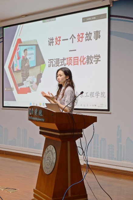 郑璐恺做了题为《讲好一个好故事——沉浸式项目化教学案例分享》的报告,她从讲述式项目、辨析式项目、工坊式项目、产教及科创项目四方面分享了多个让人印象深刻的教学案例,项目化教学的初衷在于让学生“在做中学,在学中悟”,项目的发展过程更是学生知识内化、能力强化、思维发散的成长过程。