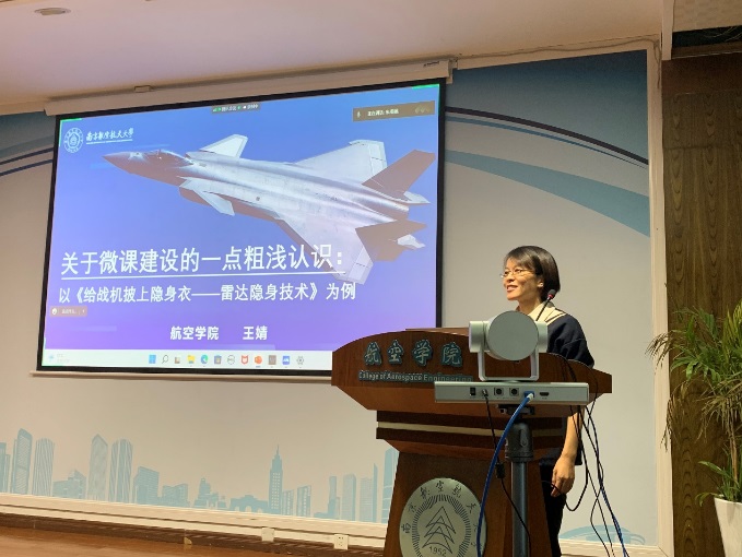 王婧做了题为《关于微课建设的一点粗浅认识》的报告,她以雷达隐身技术的视频为案例,从微课创建思路、创建方法及过程等角度,详细分享了用心负责、重视学生听课感受及有吸引力的内容在一门微课中的重要作用。