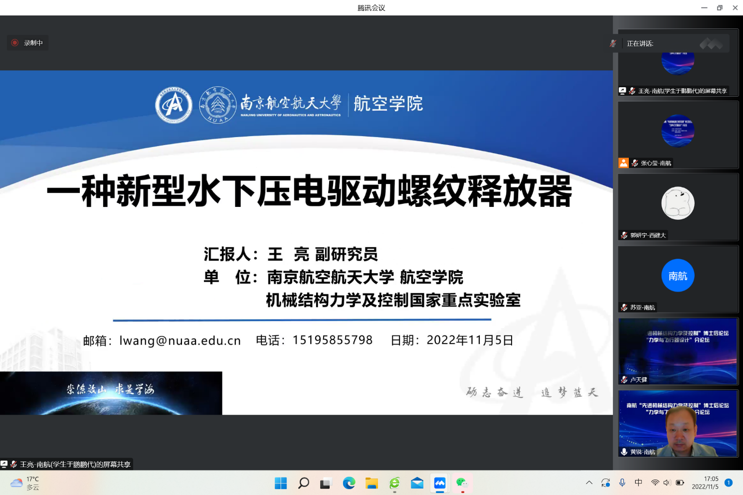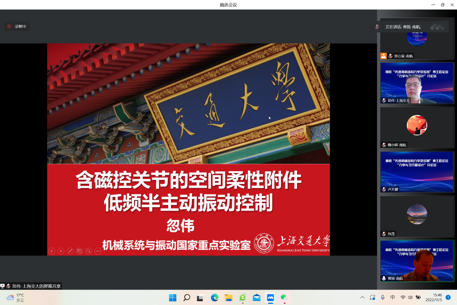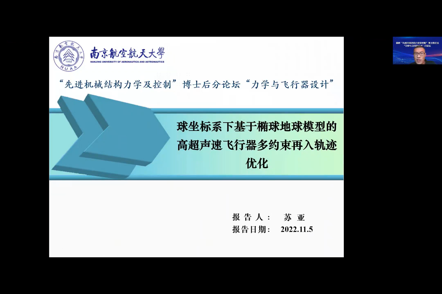 随后,6位青年学者分别围绕基于变参数磁控关节的空间柔性附件低频半主动振动控制、直升机振动主动控制的自适应频响修正-谐波识别方法、球坐标系下基于椭球地球模型的高超声速飞行器多约束再入轨迹优化、残余应力对铝合金搅拌摩擦焊接头疲劳裂纹扩展影响研究、一种新型水下压电驱动螺纹释放器、一种基于有限体积的三维线性弹性力学分析方法进行了学术报告,同步参与的专家和师生就报告内容进行了深入探讨与交流。