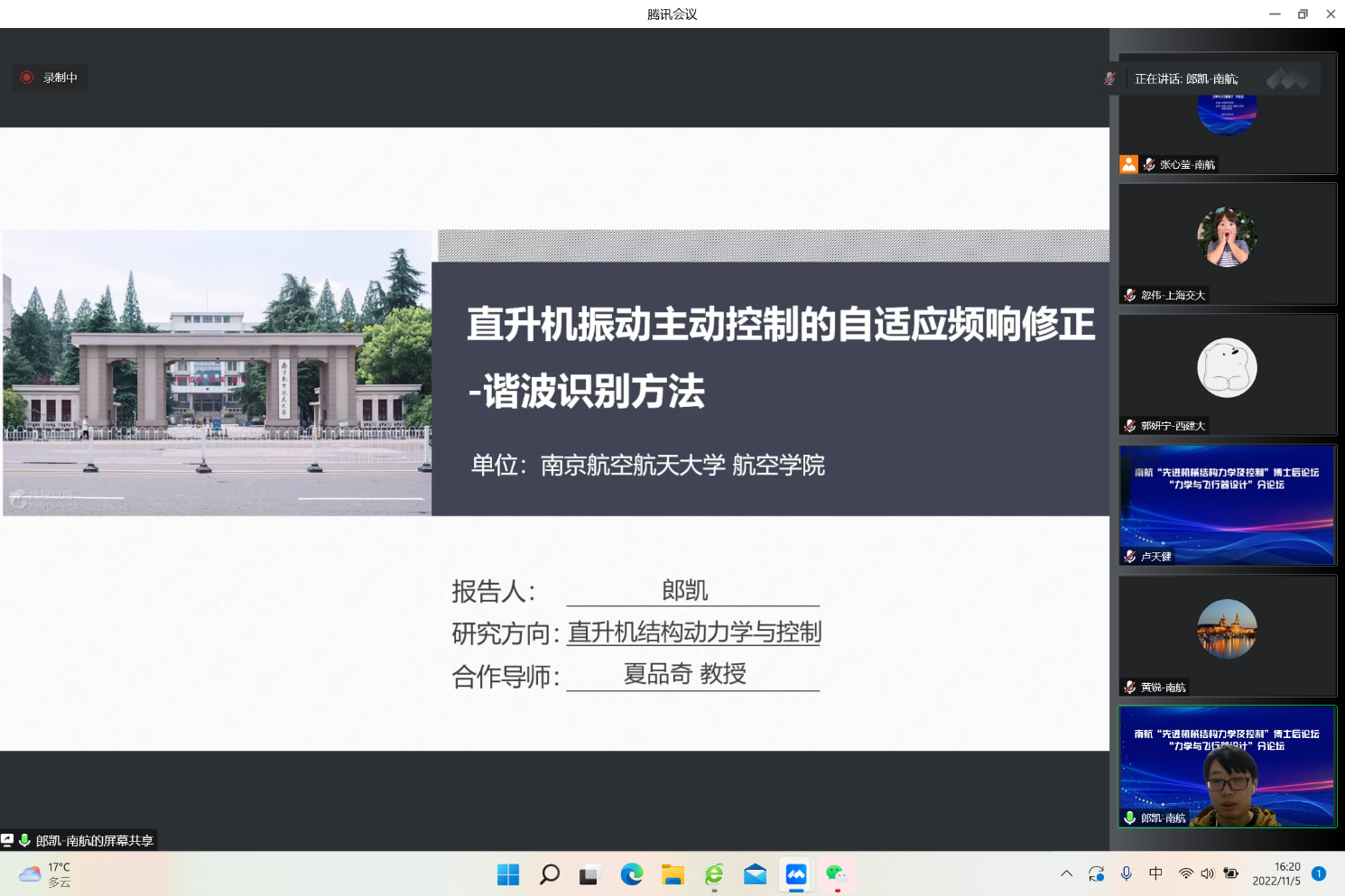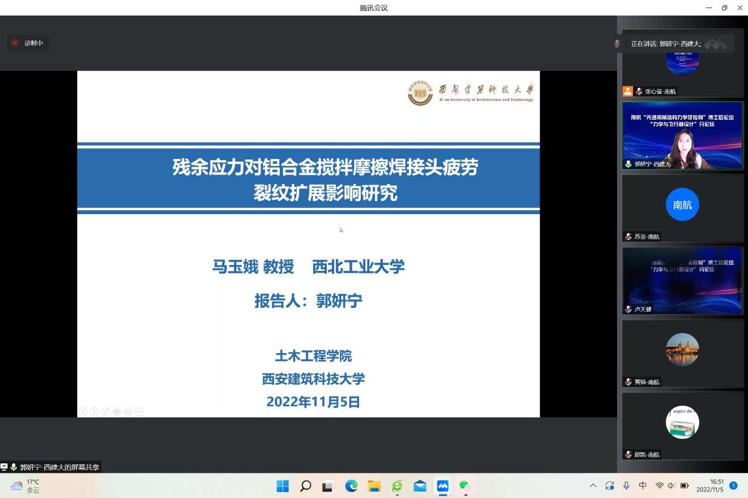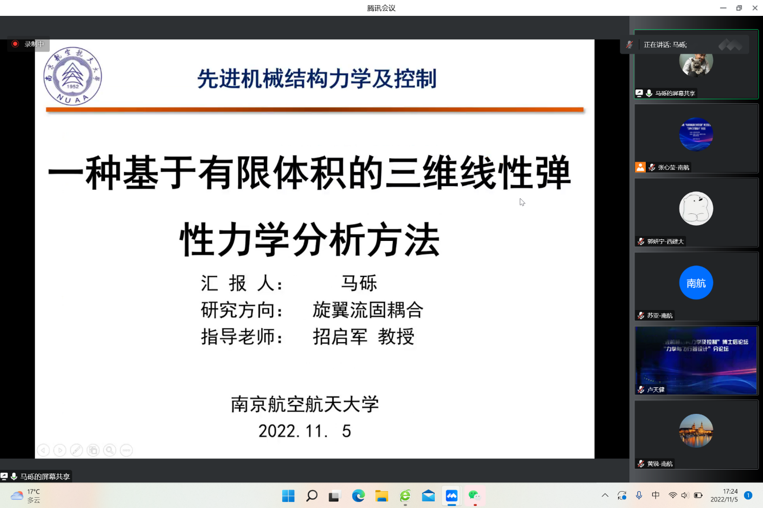 随后,6位青年学者分别围绕基于变参数磁控关节的空间柔性附件低频半主动振动控制、直升机振动主动控制的自适应频响修正-谐波识别方法、球坐标系下基于椭球地球模型的高超声速飞行器多约束再入轨迹优化、残余应力对铝合金搅拌摩擦焊接头疲劳裂纹扩展影响研究、一种新型水下压电驱动螺纹释放器、一种基于有限体积的三维线性弹性力学分析方法进行了学术报告,同步参与的专家和师生就报告内容进行了深入探讨与交流。