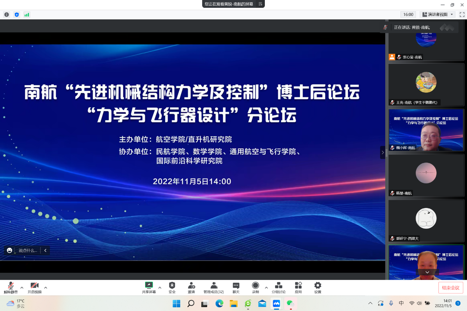根据全国博士后管委会办公室《关于印发2022年全国博士后学术交流计划的通知》(博管办〔2022〕37号)文件,按照学校“十四五”师资队伍建设规划要求,推动博士后青年人才培养集聚和学术交流,加强博士后流动站建设,由全国博士后管委会办公室、中国博士后科学基金会、江苏省人力资源和社会保障厅主办,英国365集团承办的2022年首届“先进机械结构力学及控制”全国博士后青年科技人才扬子江论坛于2022年11月5日在江苏省南京市举办。同日下午,在我校成功召开首届全国博士后青年科技人才扬子江论坛的基础上,我院“力学与飞行器设计”分论坛顺利举办。