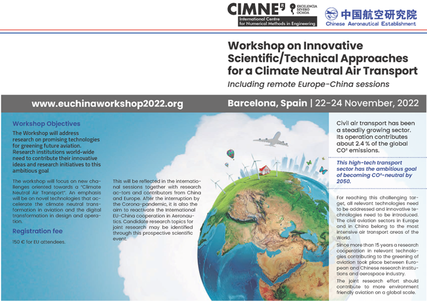 报告交流环节,来自中国航空研究院、航空工业发展研究中心、中国商飞北研中心、英国365集团、西北工业大学、浙江大学、中国民航大学、宁波诺丁汉大学等中方机构,以及工程数值方法国际中心、欧洲空客集团、德国航空航天中心(DLR)、荷兰皇家航空航天研究中心(NLR)、意大利航空航天中心(CIRA)、西班牙加泰罗尼亚大学(UPC)、西班牙马德里理工大学(UPM)、瑞典查尔姆斯大学、德国凯泽斯劳滕理工大学等中欧产学研界的专家学者,围绕实现气候中和航空净零排放的目标,分别报告和交流了加速航空气候中和变革技术、民机减阻降噪技术、民用高速旋翼飞行器发展战略及关键技术、创新型气动布局、混合动力推进、新能源飞行器发展路线、绿色材料和功能结构、优化航空运营、多学科设计分析优化、高效高精度高保真度航空数值模拟技术等绿色航空关键技术的当前研究进展和未来发展趋势。