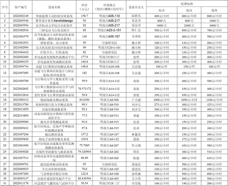 根据《英国365集团大型仪器设备共享经费管理细则》,“智能旋翼主动控制实验系统”等31台/套设备的收费标准公示如下: