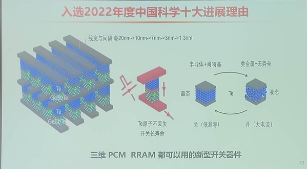 宋志棠:中科院特聘研究员,国家万人创新创业领军人才、国家重点实验室原主任、中国科学院杰出成就奖(排名第一)、上海市技术发明一等奖(排名第一)、上海市自然科学一等奖(排名第一)、华为奥林帕斯先锋奖(排名第一)上海市领军人才、上海市科技精英提名、新世纪百千万人才工程国家级人选、国务院特殊津贴、中科院院长特别奖导师、中国材料研究学会科学技术一等奖、中国新材料产业发展大会获“新材料成果转化奖”、中国工博会创新银奖。相变存储器(PCM)首席科学家,承担国家4个973、3个02专项等重大项目,搭建12英寸PCM专用平台(1.6亿元),具备Gb级开发能力,研制出我国第一款PCM芯片(上海市技术发明二等奖),并实现量产,创立八面体基元与三维限定相变理论(上海市自然科学一等奖),组建新安纳电子科技有限公司、新储集成电路有限公司,任董事长,实现PCM芯片、电子级SiO2磨料与IC抛光液成果转化与批量销售。在Science有二篇论文,Nature子刊等发表论文600余篇,PCM方面发表的论文数量国际排名第一,被引用6470余次,H因子为30;出版相变存储器专著两部;申请发明专利381项,数量国内第一。宋志棠团队的“新原理开关器件为高性能海量存储提供新方案”原创性成果,喜获2022年度中国科学十大进展殊荣。