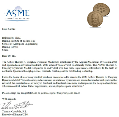 近日,美国机械工程师学会(ASME)宣布,中国科学院院士、我校原校长胡海岩荣获2023年度ASME托马斯·考伊动力学奖(ASME Thomas Caughey Dynamics Medal),以表彰其在受控机械系统的非线性动力学领域取得突出成就,揭示了时滞反馈和迟滞记忆的基本作用,改进了非线性振动控制、颤振抑制、可展开空间结构的设计。