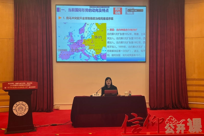 马克思主义学院青年教师邢瑞利以《当前国际形势与中国周边安全》为题,分析了当前国际形势的动向及特点、中国周边安全新态势新挑战、中国国家安全底线及其应对,希望同学们更好地认识国内与国际两个大局,树立正确的历史观、大局观、角色观,主动投身推动中国式现代化发展。