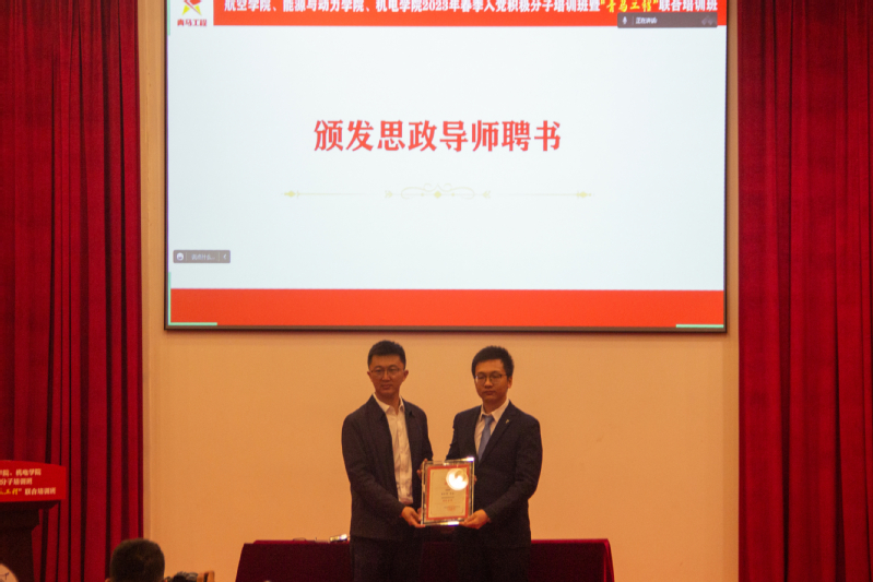 赵铮为全国劳动模范、全国青年岗位能手彭晨晞颁发思政导师聘书。