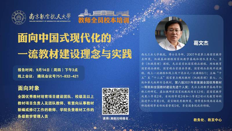 各位老师好,转学校教材科通知,9月14日(本周四)下午3点,学校邀请了首届全国优秀教材一等奖获得者、全国教材建设先进个人、西北工业大学葛文杰教授做题为“面向中国式现代化的一流教材建设理念与实践”线上报告,腾讯会议号751-832-421,请全国优秀教材培育项目建设团队、校级及以上教材项目负责人及团队教师、有意向从事教材新编或修订工作的教师、学院负责教材工作的教学管理人员积极参加。注:此次培训将纳入教师全员校本培训的学分管理,请用i.南航扫码报名