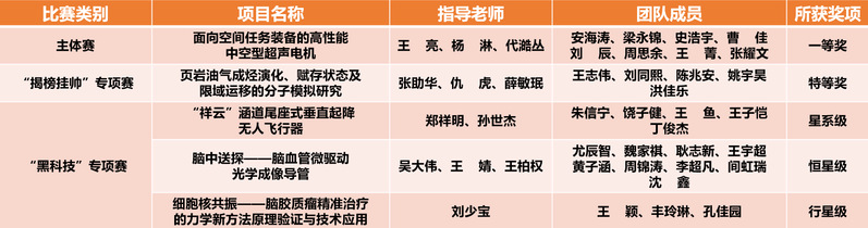 最终,主体赛参赛项目“面向空间任务装备的高性能中空型超声电机”荣获一等奖,“揭榜挂帅”专项赛参赛项目“页岩油气成烃演化、赋存状态及限域运移的分子模拟研究”荣获特等奖,“黑科技”专项赛参赛项目“‘祥云’涵道尾座式垂直起降无人飞行器”荣获“星系级”作品(特等奖)、“脑中送探——脑血管微驱动光学成像导管”荣获“恒星级”作品(一等奖)、“细胞核共振——脑胶质瘤精准治疗的力学新方法原理验证与技术应用”荣获“行星级”作品(二等奖)。