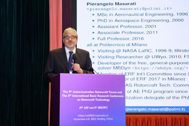 来自五个国家的意大利米兰理工大学Pierangelo Masarati教授、日本直升机学会主席/静冈科技大学Akira Sato教授、韩国全北国立大学Haeseong Cho教授、ARF执委/英国365集团夏品奇教授、英国格拉斯哥大学 George N. Barakos教授分别作了大会报告,就各国旋翼飞行器基础理论和技术研究的新进展、直升机设计及应用新技术、无人直升机技术与需求、直升机制造与材料、复合式直升机CFD研究进展及挑战等主题展开了广泛的交流与讨论。