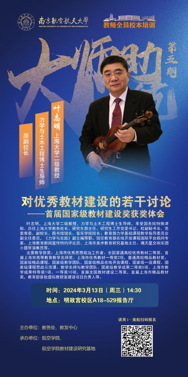 为进一步加强新时代教材建设,推进学校教材建设高质量发展,提升教师教材编写能力,学校邀请上海大学二级教授,力学与土木工程博士生导师、原副校长叶志明教授开展优秀教材建设专题讲座。具体安排如下: