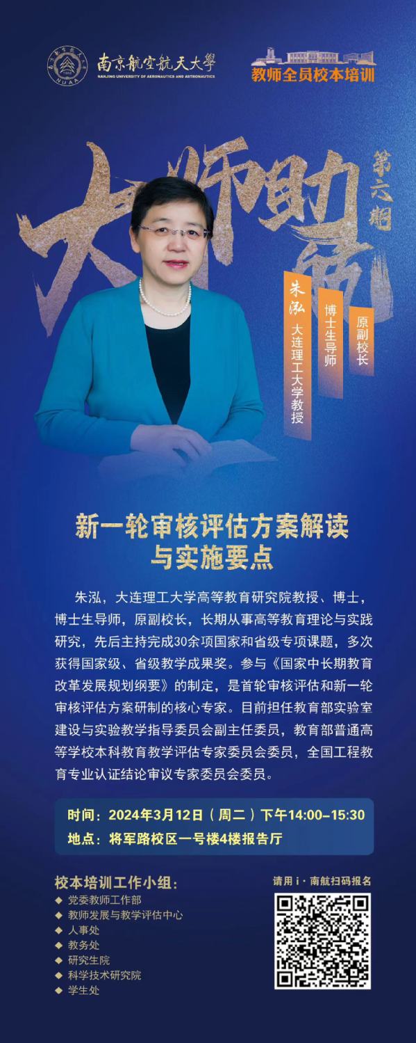 请各学院、单位积极动员相关教师报名参与(用i.nuaa系统扫码预约报名),并提醒参会人员提前10分钟进入会场。烦请各位做好迎评培训的组织动员工作。谢谢!