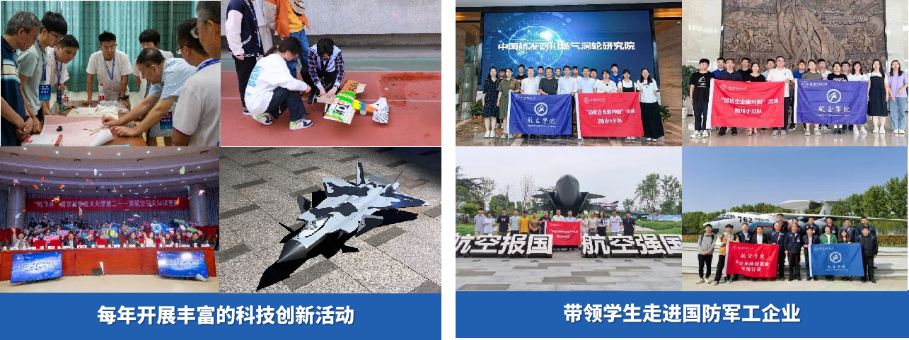 通过举办航空航天知识竞赛、飞行器复原制作大赛、科创训练营等双创活动,打造低年级普惠教育,高年级拔尖领航的实践育人体系通过访企拓岗、国防企业面对面、社会实践等活动,每年带领500余名学生走进国防军工企业,实地感受军工文化,树牢航空强国志。院士、总师授课,与学生共话航空航天蓝图,为学生描绘专业方向。