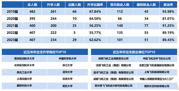 根据江苏省招生就业指导服务中心、学校及学院调研数据显示,近5年学院本科年终就业率始终保持在80%以上,其中升学出国率超过60%,涵盖国内知名双一流高校,以及国际知名学府。通过对重点用人单位的持续回访和调研,航空军工企业对本专业人才培养工作的满意度超过96.8%。其中,对学生在问题分析能力、自主学习能力、沟通能力、团队协作能力、职业素养、科学研究能力等方面满意度超过95%,对专业人才培养质量给予了高度认可。