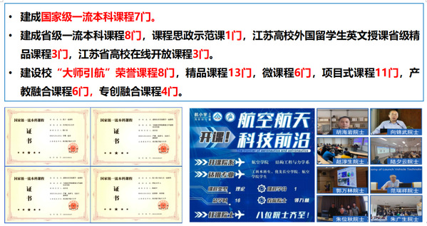 学院以培养能肩负起新时代航空强国重任的德才兼备人才为着眼点,把“家国情怀、使命担当”的红色基因文化融入人才培养全过程。学院不断改革课程教学模式,开创了课程学习—科学研究—工程实践—思政教育一体化“大课程”教学模式,实施新工科培养方案与学科前沿、显性课程与隐性课程、课程内容与科技成果、科研训练与企业实践、论文选题与科研项目、专业教育与思政教育等“六融合”教学举措。将第一课堂与第二课堂贯通,通过“国防企业面对面”“总师思政公开课”“青马工程”“一杯咖啡的故事”“续火烛心,寻迹长空”等品牌活动,将“大飞机精神”“载人航天精神”“北斗精神”等军工文化和“志在长空、航空报国”的南航文化厚植于学生心中,促进学生“智商、情商、逆商”的全面发展。同时,学院获批教育部首批“三全育人”综合改革试点,建成学校首批教育部课程思政示范课程。2021年“起落架设计基础”获批国家级课程思政示范课程,“漫谈新材料在航空航天领域的应用”获批江苏省思政示范课程等,其他校级和院级思政示范课程合计11门。1名教师入选2021年国家级课程思政教学名师。2022年学院与校教师发展与教学评估中心教发合作申报产学合作协同育人项目;同年,学院牵头申报的校“揭榜挂帅”课题“航空航天民航特色课程思政案例库建设”获批,并高质量完成了建设工作。此外,学院协助学校成功申报了2023年教育部第二批高校数字思政精品项目。