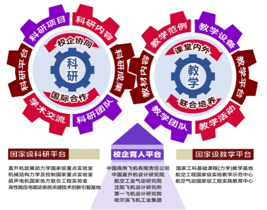 现代飞行器是高度复杂的集成系统,具有典型的新工科属性。为培育具备国际竞争力的高素质复合型新工科人才,学院以跨院系、跨学科、跨专业的“新工科”教育模式为依托,坚持横向融合与纵向贯通相结合,以院-院协同育人联盟为载体,通过“1+X”班主任团队、项目制实习、企业课程等举措,促进各要素汇聚、融合、相济,实现高水平的院-院协同、校企贯通、校际互动、国际互通,形成内循环和外循环相济共生的“跨界融合”协同育人生态。学院以汇聚校企优势资源为基础,开拓“学科交叉、校企联合、校际协同”资源融合路径,通过建立航宇与力学学科群,实现跨学科资源共享;通过建立校企联合实训基地和实验室等,实现校企育人资源共建互享;通过共建协同创新中心等方式,实现重大仪器设备校际共享、师资队伍优势互补;通过不断探索现代教育教学理念和方法,打造“金课”和高水平教材,深化课程思政教学改革,在高质量航空航天人才培养上有了新突破,取得了一批重大教学成果。