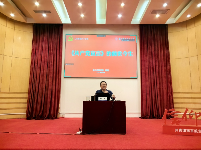 无人机研究院党委副书记、副院长杨波以“《共产党宣言》的前世今生”为题作报告,从《共产党宣言》的取名、诞生、关键词、内容等方面展开,带领同学们在历史中感悟马克思主义的诞生对全世界的无产阶级革命运动起到的推动作用,领会《共产党宣言》至今仍在影响中国、推动中国发展的伟大意义。