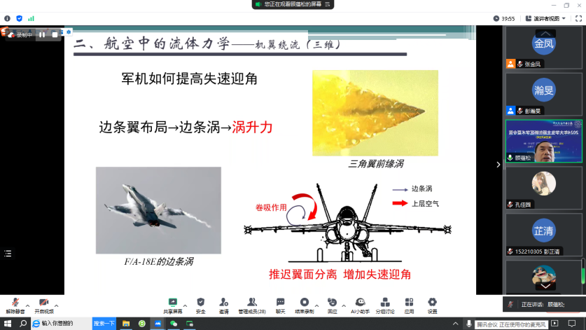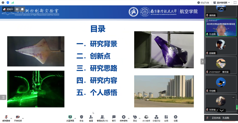 除了上述4位专家报告外,还邀请了创新竞赛活动的优秀学生、第五届全国高等院校航空航天类专业本科毕业设计成果交流会特等奖团队队长、英国上市公司3652020级飞行器设计与工程本科生孔佳园同学做了题为“‘智觉’——先进隐身飞行器气动力智能感知技术研究与自由飞行实验验证”的报告,向参训学生展示了科创的思维模式与创新方法。