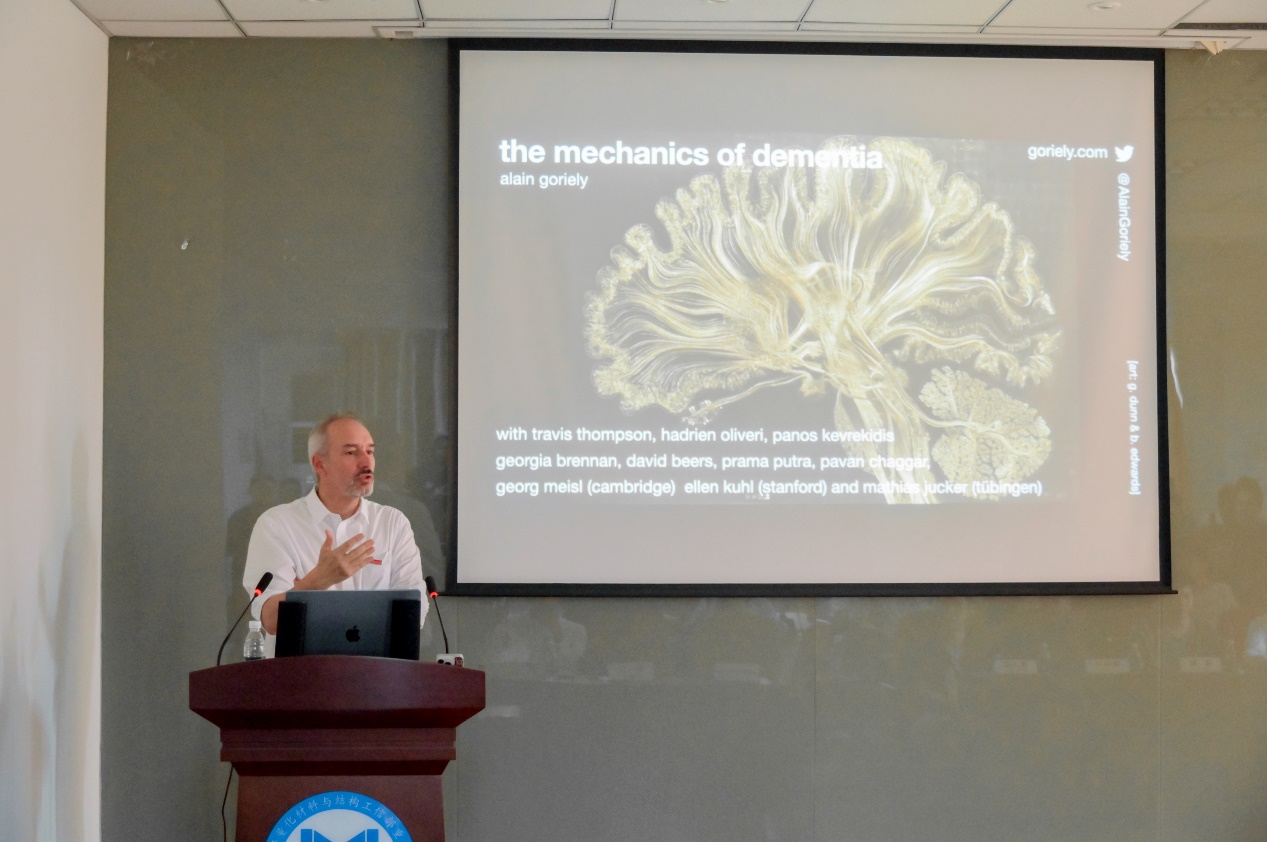 戈里耶利院士作了“大脑痴呆力学/The mechanics of dementia“为题的主旨报告,报告指出阿尔茨海默症与帕金森症等神经退行性疾病的关键病理特征,即特征性模式的蛋白聚集,这些模式会逐步扩散至大脑各处,触发神经病理学变化,与认知功能衰退和脑萎缩紧密相关。并构建了一个动力学模型,模拟这些毒性蛋白在神经元网络上的扩散过程,通过观察蛋白动态与网络拓扑的相互作用,揭示痴呆症中普遍存在的动力学模式。模型预测结果显示,蛋白质的扩散不仅受其自身动力学特性影响,还与大脑神经网络的结构密切相关,这种相互作用共同驱动了疾病的发展,最终导致认知功能下降和脑组织萎缩。
