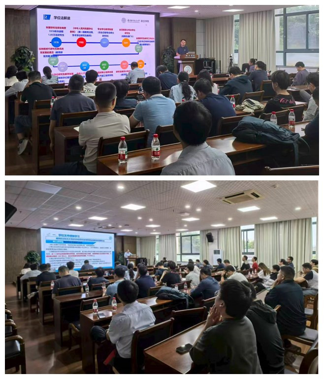 随后,师岩教授聚焦新《学位法》与研究生教育政策,带来政策解读与实践分享。他首先回顾了2025年7月6日至12日,由省教育厅主办、江苏大学承办的第十二期江苏省研究生导师(管理干部)研修班学习经历,随后带领参会人员深入学习新《学位法》—— 从立法背景与时代形势出发,详细剖析法律条文的主要变化,重点解读了学位授予标准、质量监管机制等核心内容,明确新《学位法》对 “强化研究生培养过程管理、严格学位授予出口关” 的刚性要求。此外,师岩教授还系统梳理了学校近年来学位与研究生教育改革的重点举措,包括招生工作、培养工作、导师队伍建设、教育管理工作和主要政策调整内容,为导师们精准把握政策导向、规范开展培养工作提供了清晰指引。