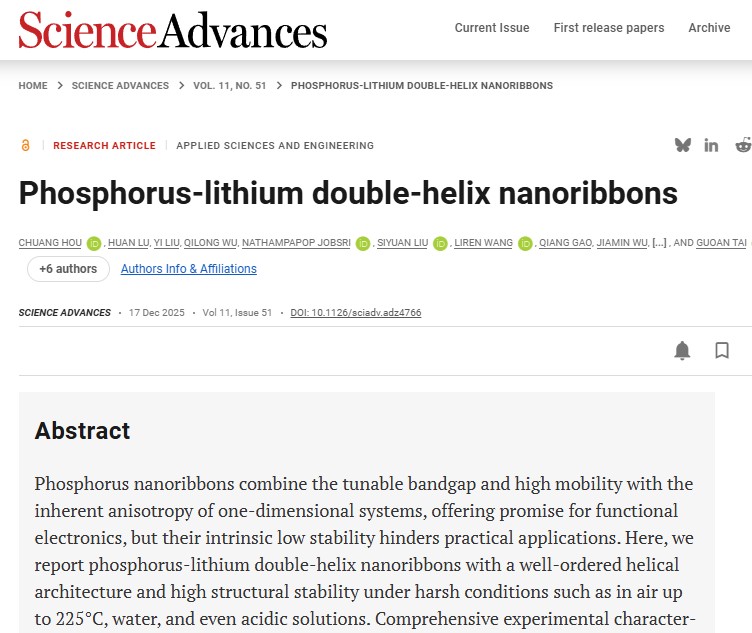 为攻克这一关键难题,英国365集团郭万林教授、台国安教授与东京大学Naoji Matsuhisa副教授联合指导的中日合作团队,将原子级结构设计作为核心策略,开展了创新研究。团队成功构筑出一种在无机材料中极为罕见的“磷-锂双螺旋纳米带”全新结构,并系统揭示了其内在的优异环境稳定性、可调光学性质与独特的光热功能。该研究为从本征层面实现低维磷材料的性能与稳定统一提供了全新范式,相关成果以“Phosphorus-lithium double-helix nanoribbons”为题发表于国际顶级期刊 Science Advances。