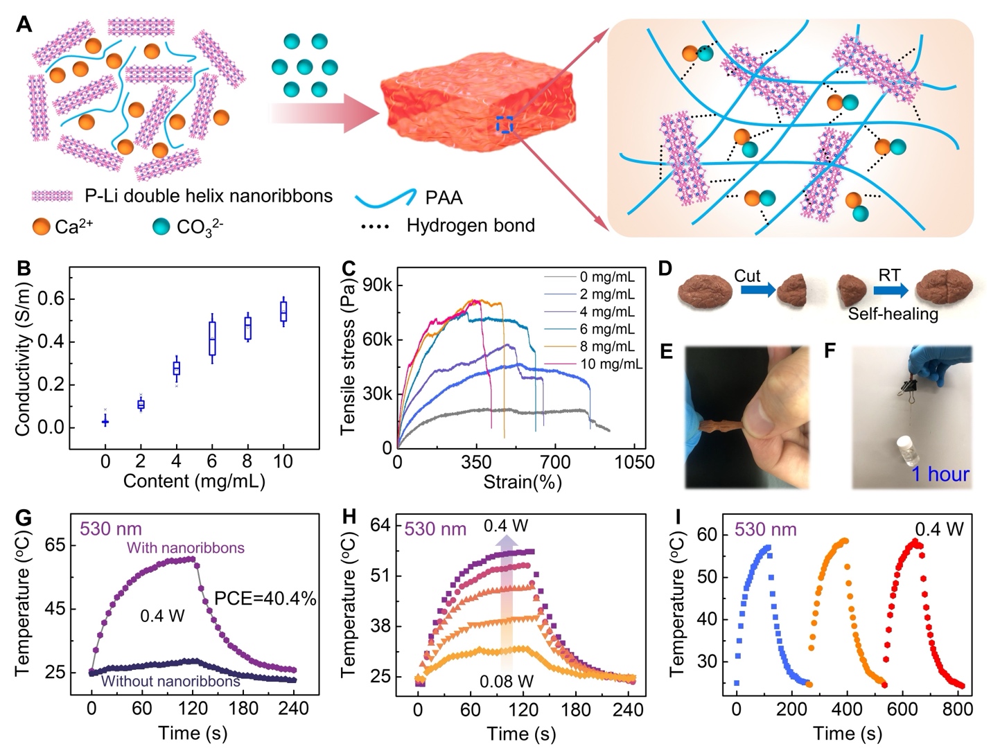 得益于磷-锂双螺旋纳米带优异的水稳定性,研究团队成功将其引入水凝胶基质,进而构筑出一种集高导电性、自修复能力与高效光热转换于一体的多功能复合水凝胶。性能测试表明,在530 nm可见光照射下,该材料的光热转换效率高达40.4%,并且经历多次升降温循环后性能几乎无衰减,展现出卓越的服役稳定性。这一特性组合,使其在光热成像、精准温控、潜在的光热治疗以及柔性生物电子界面等领域展现出广阔的应用前景,为开发新型智能生物医用材料提供了创新平台。