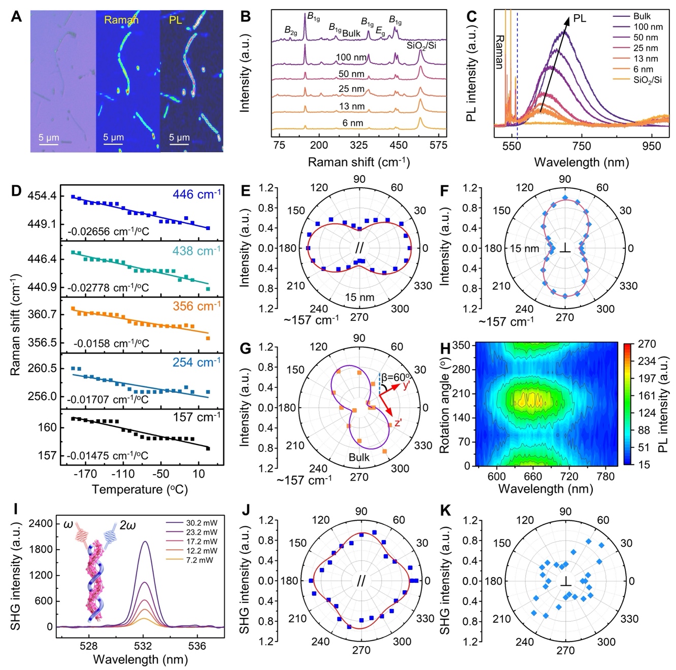 在光学性质方面,该磷-锂双螺旋纳米带展现出优异且可调谐的响应特性(图3)。其带隙可在2.13 eV(单层)至1.78 eV(多层) 范围内连续调控。得益于其一维结构特征,材料表现出显著的拉曼与光致发光各向异性:偏振相关的测试结果明确揭示了其光学响应强烈的方向依赖性。此外,该材料还具备稳定的二次谐波产生非线性光学效应,且在 -190°C 至 120°C 的宽温区内保持优异的光谱稳定性。这些特性使其在偏振敏感光电探测、非线性光学转换及光子信息调控等领域具有明确的应用潜力。