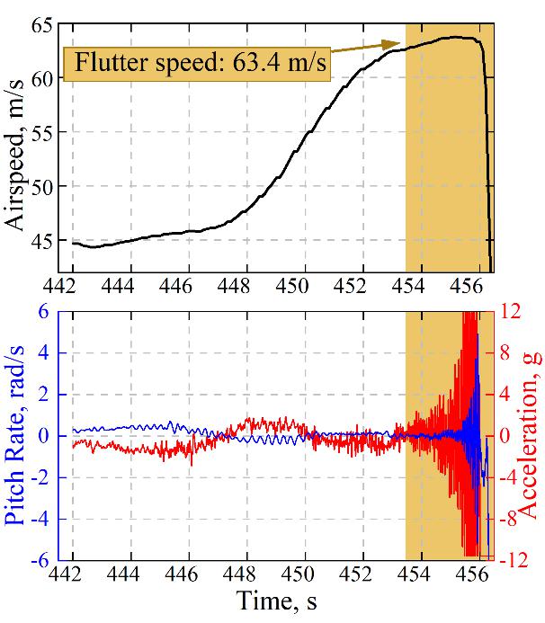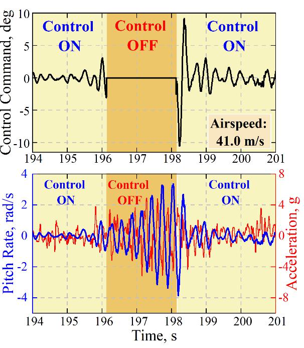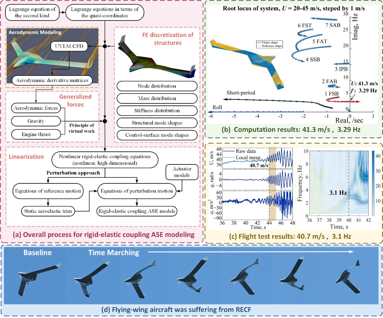 该团队攻克了超临界飞行条件下受控对象的“天地一致性”建模、考虑弹性效应的定速增稳控制、刚-弹耦合颤振抑制系统设计等关键技术。自主研制了展弦比超过10的柔性飞翼布局无人机,成功完成了具有极高风险的刚-弹耦合颤振抑制飞行试验,将刚-弹耦合颤振临界速度提升62.5%,在世界上首次突破结构强度极限内的刚-弹耦合颤振屏障(图4)。