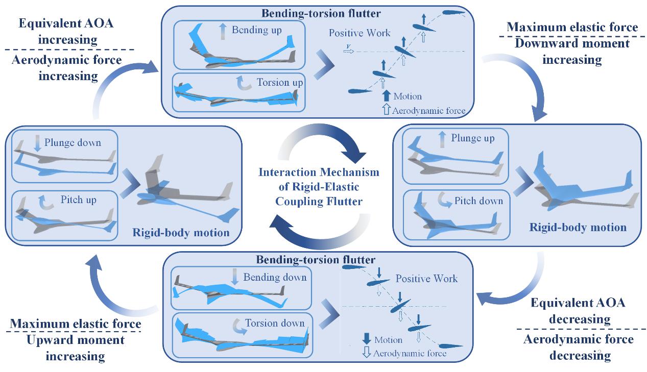 团队提出仅含四个自由度的刚-弹耦合动力学模型,探明了刚-弹耦合颤振中飞行力学的短周期模态、沉浮模态与结构弯曲模态、扭转模态间的耦合效应(图2),揭示了敏感参数对刚-弹耦合颤振特性的影响规律。