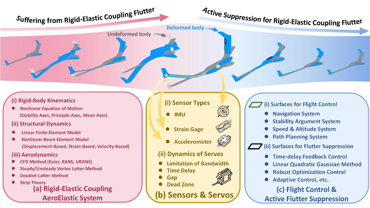 飞翼布局飞行器是新一代战略轰炸机、高空无人侦察机首选的气动布局。然而,这类飞行器的机体俯仰转动惯量小、机翼弯曲频率低,导致其刚体短周期俯仰模态与机翼低阶弹性模态在气流作用下相互耦合,诱发刚-弹耦合颤振,严重限制飞行器的飞行包线和任务执行能力。如何突破刚-弹耦合颤振屏障已成为新一代飞翼布局飞行器研制亟待解决的核心难题。